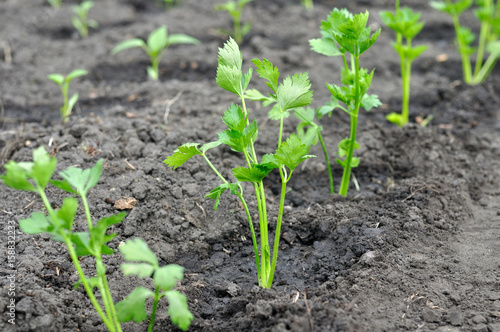 freshly planted celery seedlings and pepper seedlings ( on background) in the vegetable garden