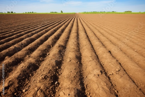 Freshly plowed field shows perfect furrows ready for planting crops under a clear blue sky