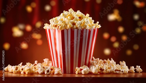 freshly popped buttered popcorn in classic red and white striped container on rustic wooden surface, perfect snack for movie night, theater, or entertainment event