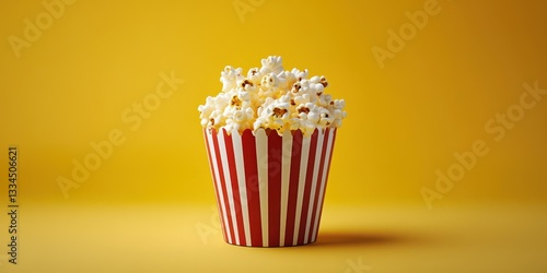 Freshly popped popcorn in a striped container against a yellow background ready for movie night