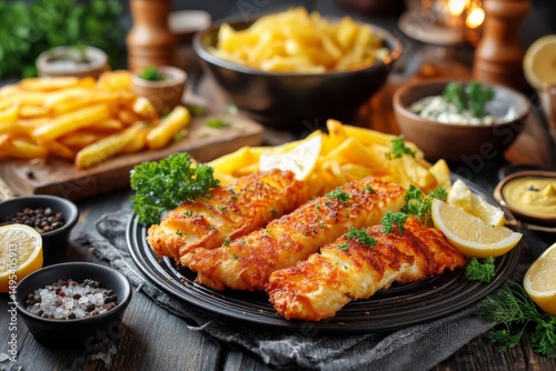 Freshly prepared fish and chips with lemon and herbs served on a rustic wooden table at a cozy restaurant