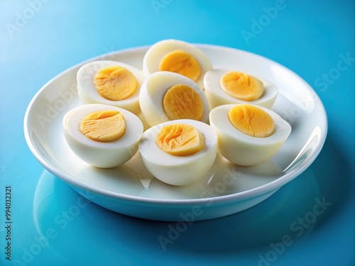 Freshly prepared hard-boiled eggs arranged artfully on a white ceramic plate against a clean blue background, with a slight shadow and reflection.