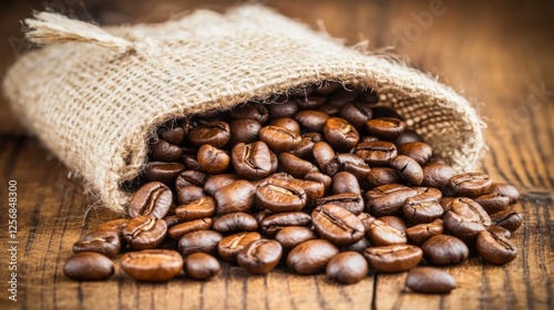 Freshly Roasted Coffee Beans Spilling from Burlap Sack on Wood Surface