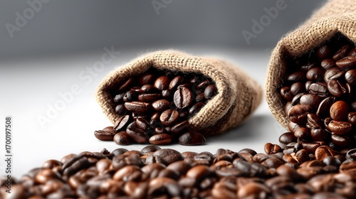 Freshly roasted whole coffee beans spill from natural jute sacks, forming a beautiful aromatic brown pile ready for brewing enjoyment.