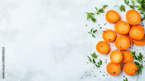 Freshly sliced carrots placed on a light surface, garnished with green herbs and black pepper, showcasing their vibrant orange color and texture.