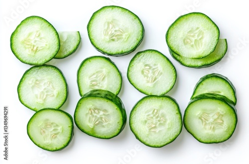 Freshly Sliced Cucumber Rounds on White Background Ideal for Healthy Cooking, Salads, or Refreshing Summer Dishes, Great for Food Photography and Culinary Ideas