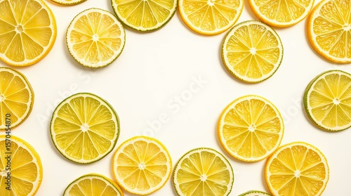 Freshly sliced lemons and limes arranged on a bright white background from above