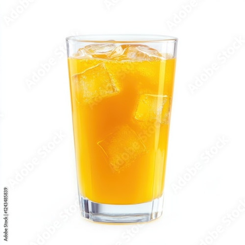 Freshly squeezed orange juice with ice served in a clear glass on a sunny day in a bright kitchen