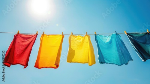 Freshly washed colorful clothes hanging on a clothesline under a clear blue sky. Gentle breeze and bright sunlight, capturing the essence of a perfect laundry day.