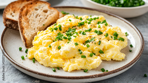 Freshly Whisked Scrambled Eggs Served with Toast and Chopped Scallions on a Rustic Plate