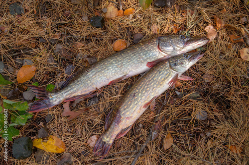Freshwater pike fish. Two freshwater pike fish on yellow leaves at autumn time..