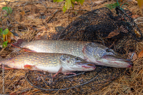 Freshwater pike fish. Two Freshwater pikes fish lies on keep net at autumn time..
