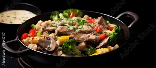 Fried beef stroganoff with vegetables in skillet dark background gourmet meal presentation