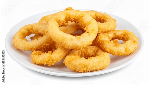 Fried calamari rings on plate isolated on white background with full depth of field for appetizer or Mediterranean seafood concept