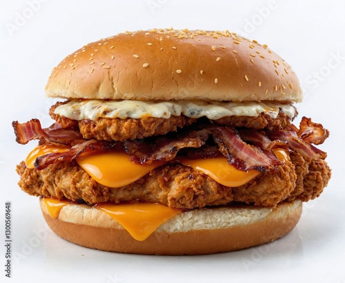 fried chicken burger that have 4 fried chicken fillets inside, with melted cheddar cheese, bacon and barbecue sauce and orange sauce