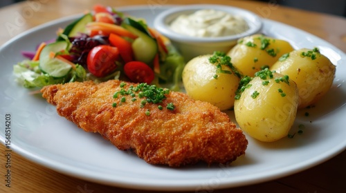 Fried chicken fillet, boiled potatoes and vegetable salad, no logos, no brands