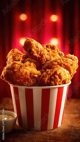 Fried chicken in striped bucket at diner; red spotlights, for food blog/menu use