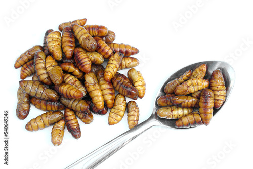 Fried chrysalis isolated on white background. Concept : weird food. Traditional Thai Street Food, Edible Worms. Weird food. Insect eating. High protein.