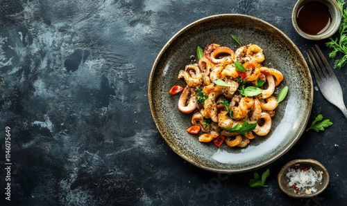 Fried crispy squid rings in tempura. Tasty snack on a plate, on rustic background with copyspace