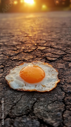 Fried egg on hot pavement at sunset