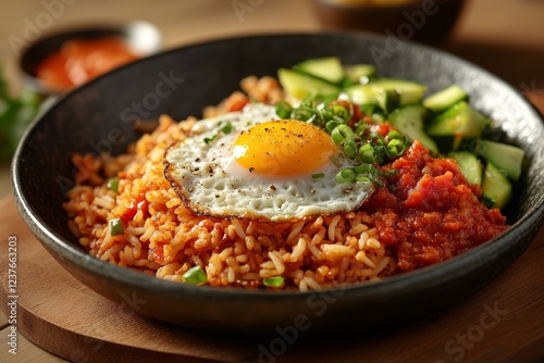 Fried egg, tomato rice, cucumber, healthy meal