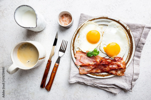 Fried eggs and bacon for breakfast on a plate, top view, copyspace