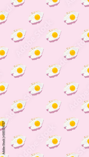 Fried eggs on a light pink background, pattern. Minimalism, top view. Breakfast concept, fried food.