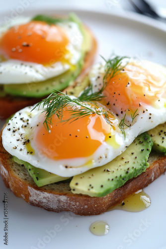 Fried Eggs on Toast with Sliced Avocado and Dill