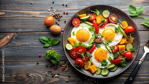 Fried eggs with colorful vegetables on a plate , nutritious, breakfast, organic, vegetarian, tasty, cooked