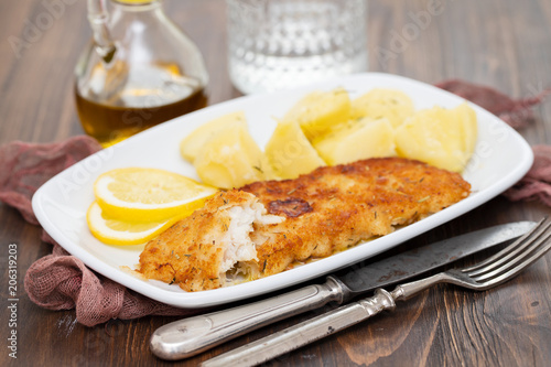 fried fillet of fish with boiled potato on white dish