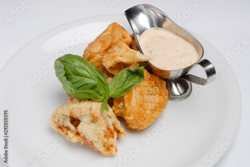 Fried fish nuggets with white sauce on a plate on a gray background