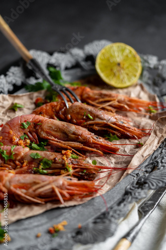 fried king prawns with lemon grilled, a small depth of field. food composition on a gray background.