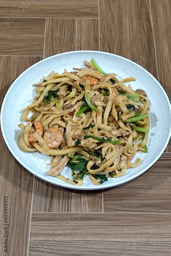 Fried noodles with vegetables and shrimp, looks very delicious served on a plate.