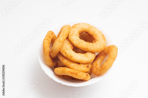 Fried onion rings in a white bowl