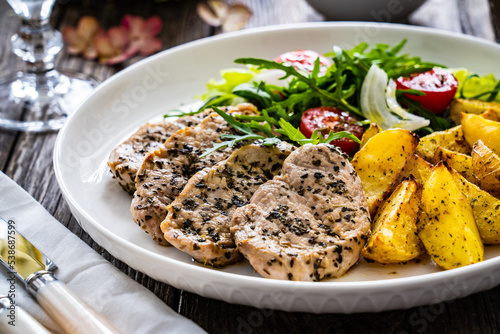 Fried pork loin with baked potatoes and fresh green vegetables on wooden table