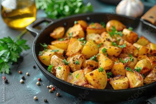 Fried potatoes in frying pan top view. Pieces of baked potatoes with garlic and greens on a dark blue background. Breakfast