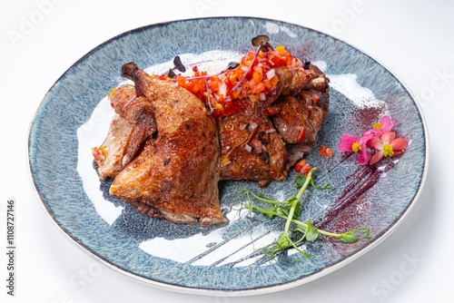 Fried Quail with Greens and White Sauce on a Plate Against a White Background