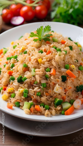 Fried rice is very tempting and looks delicious, complete with vegetables and meat, in vertical form