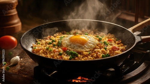Fried rice with egg on a black pan