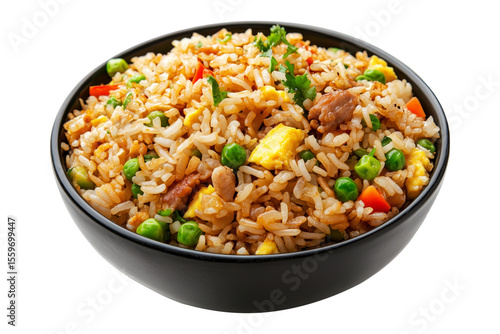 Fried rice with peas, scrambled eggs, red bell peppers, and beef pieces in ceramic bowl isolated on white transparent background, concept of Asian cuisine