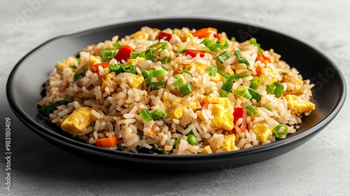 Fried rice with scrambled eggs and vegetables, isolated on a modern black plate with a light gray background