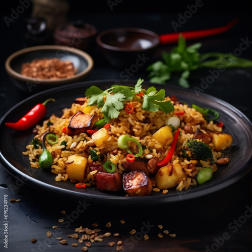 Fried rice with vegetable topping is served above