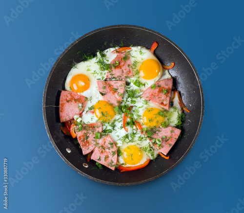 Fried sausage fried eggs in a pan. Top view
