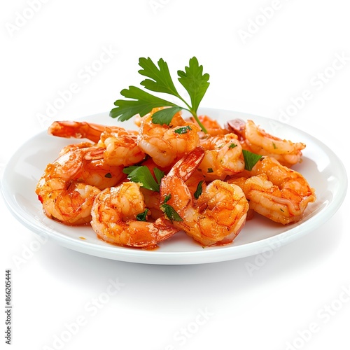 Fried Shrimp on a white plate, isolated in the middle of a white background with no shadows or decorations. The shrimp are golden brown and have a vibrant color.