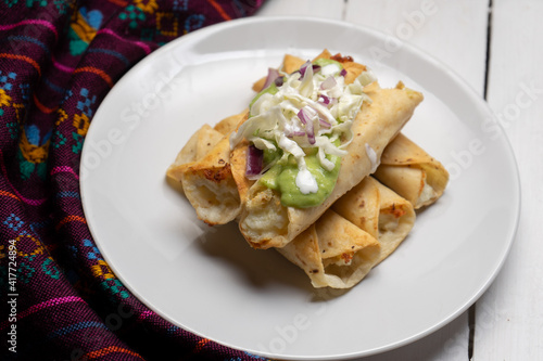 Fried tacos called flautas with guacamole and cabbage on white background. Mexican food