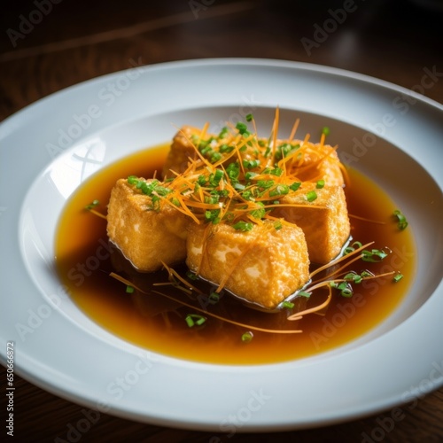 fried tofu with dashi-based sauce, golden brown tofu glistening with umami-rich broth nicely garnished with thinly chopped scallions