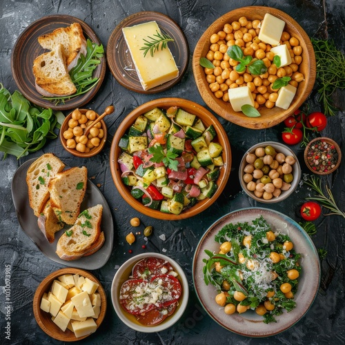 Fried Vegetable Salad, Green Mix Meat and Chickpeas, Cheese Plate and Freshly Baked Bread