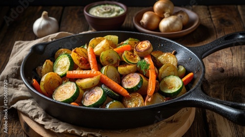 Fried Vegetables with Crispy Potatoes, Carrots, Zucchini, and Roasted Garlic in a Frying Pan