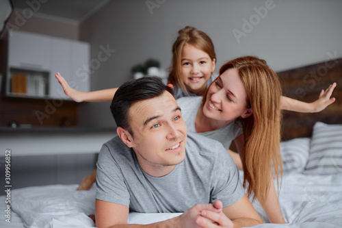 friendly and happy caucasian family, mother and father with child girl lying on bed, wearing casual clothes at home. portrait