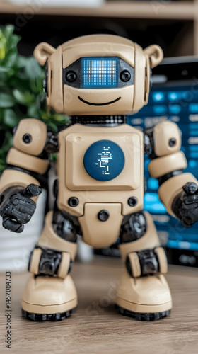 Friendly beige robot stands on desk, plant & tech background, educational toy concept